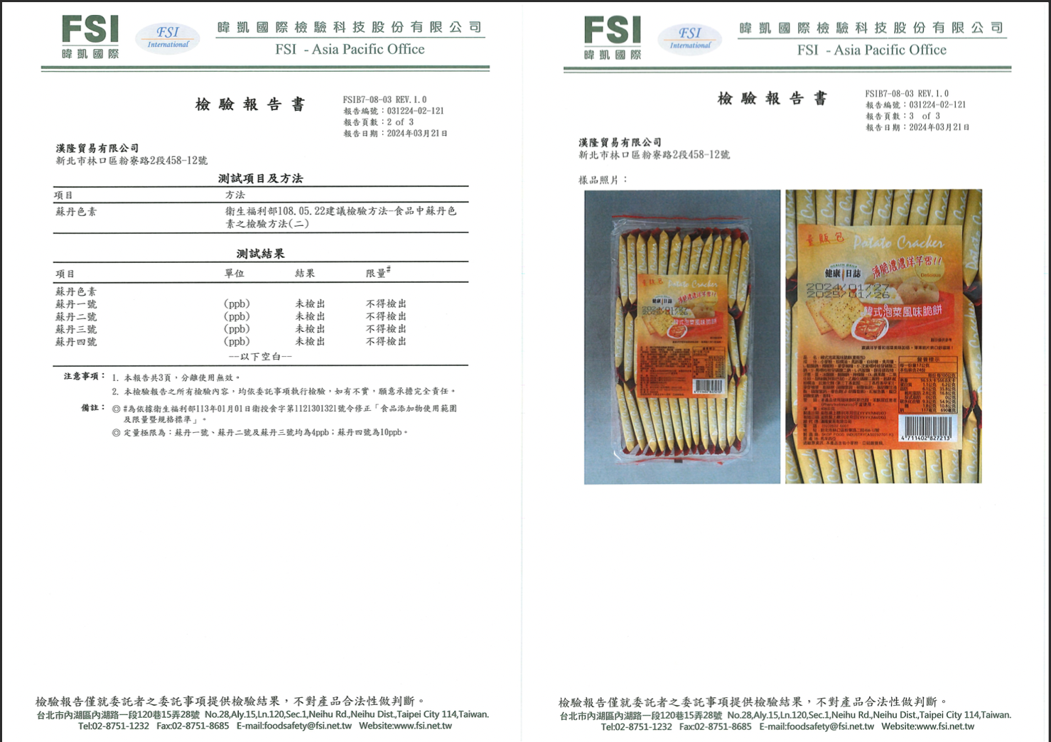 老騾子辣椒醬 因應2024年蘇丹紅食安事件的聲明稿及檢驗報告 葵果酸辣醬 檢驗報告 元歲本舖 聲明 佛蒙特咖哩塊 原廠聲明 健康日誌椒麻味蘇打餅、健康日誌洋芋脆餅(泡茶味)廠商聲明及檢驗報告 2024.3.22 蘇丹紅檢驗報告結果